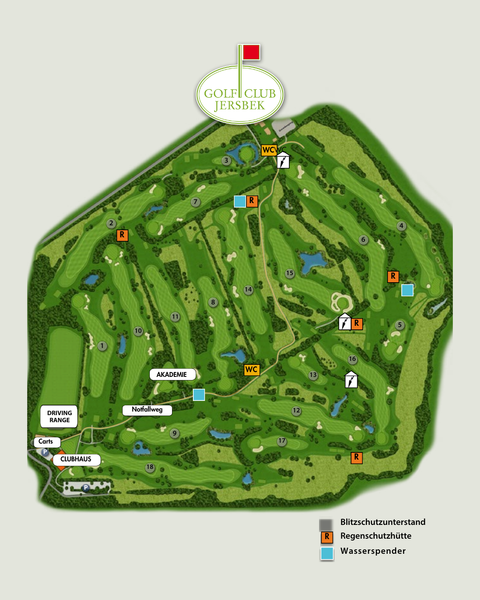 Mit unserem Platzplan finden Sie sich auf der gesamten Anlage schnell zurecht: Alle 18 Bahnen sind übersichtlich dargestellt – inklusive wichtiger Servicepunkte wie WC, Wasserspender, Regenschutzhütten und Blitzschutzunterständen. Ideal zur Vorbereitung Ihrer Runde und zur Orientierung unterwegs.